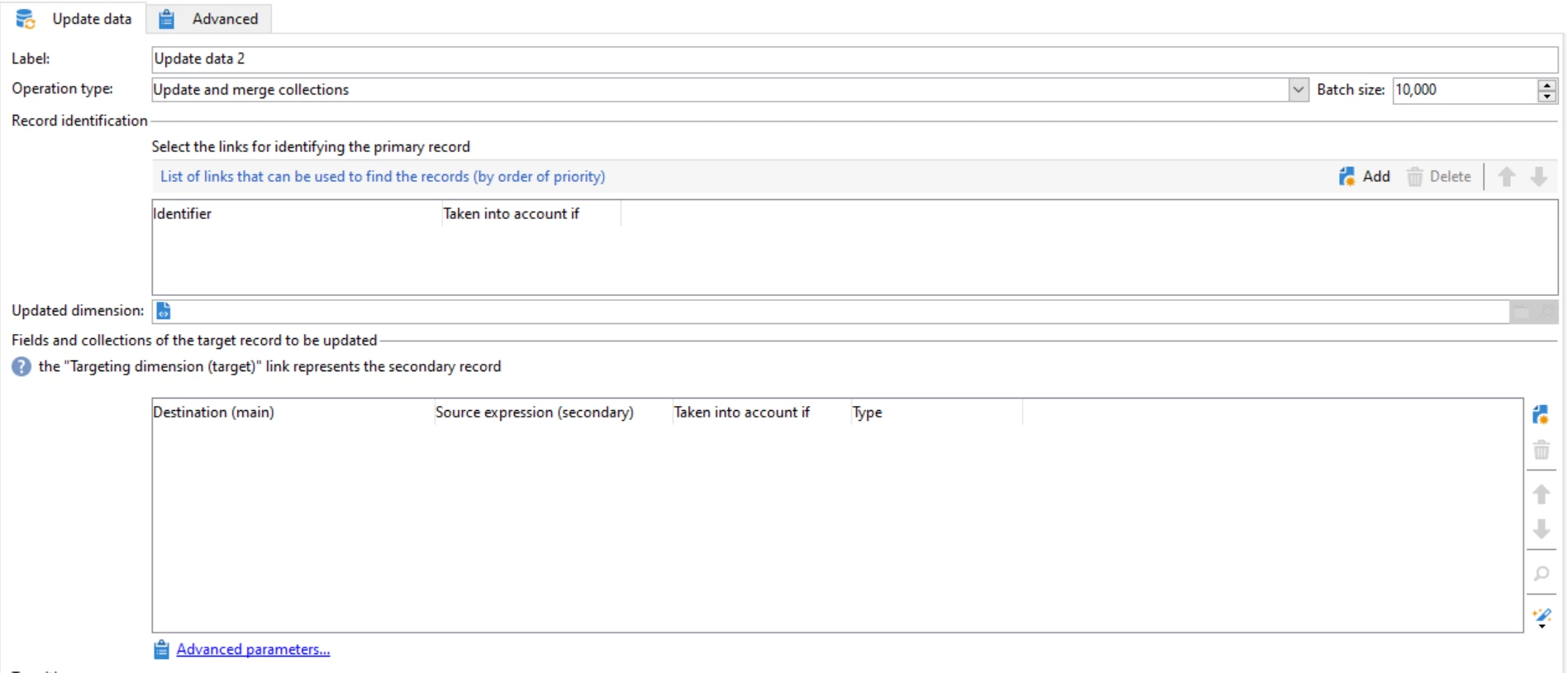 When I select Operation type as 'Update and merge collections' in update data activity, what configuration to be made for 'Record Identification' section and 'field and collection of target record to be updated' section.?