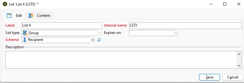 When you create new list it will be automaticall of type Group. It is static list of recipients.You can add recipients here manually via rich client.