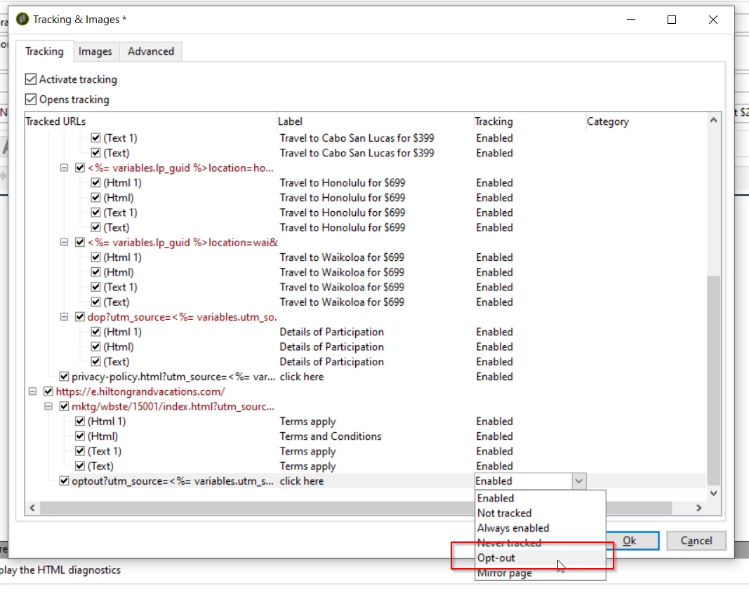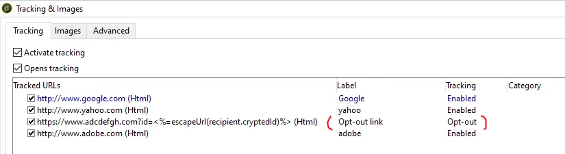 Is there a way to automate this so that whenever it recognizes our Opt-Out link, the tracking is automatically enabled for delivery reporting, and the Tracking column is always "Opt-out" for that link? See the screenshot for reference.