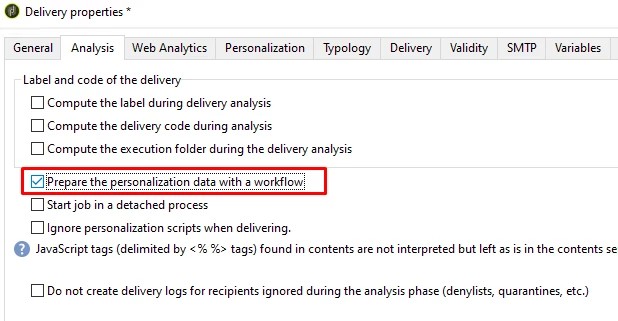 Prepare the personalization data with a workflow : this option allows to prepare the personalization data contained in your delivery in an automatic workflow, which can make you achieve a significant increase in performance for executing personalization.