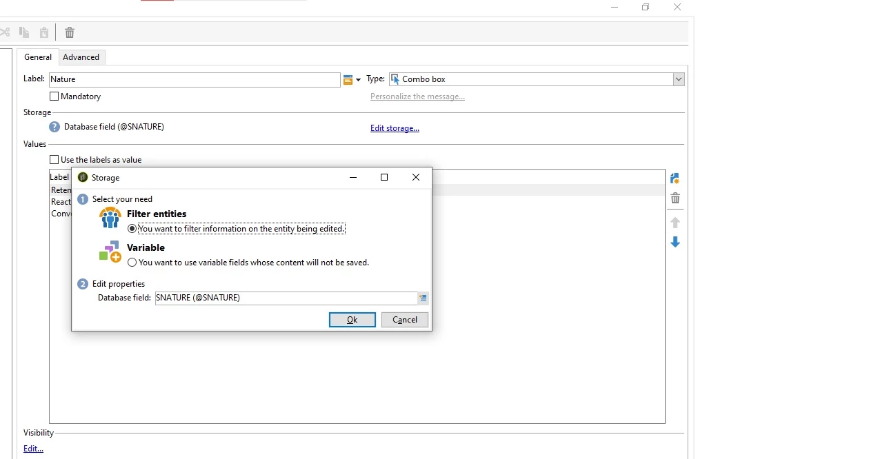 - Create the combo box and set to the data base field (screen shot 4)
