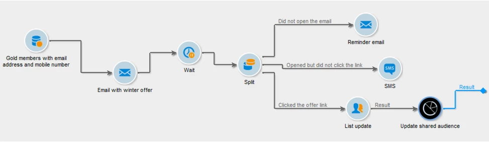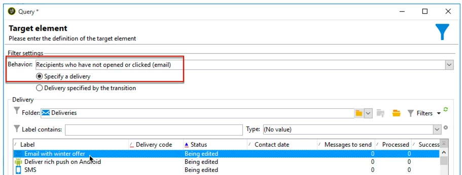 - In the filter settings, select Recipients who have not opened or clicked (email) from the Behavior drop-down list and select the email including the offer you want to send from the delivery list. Click Finish .