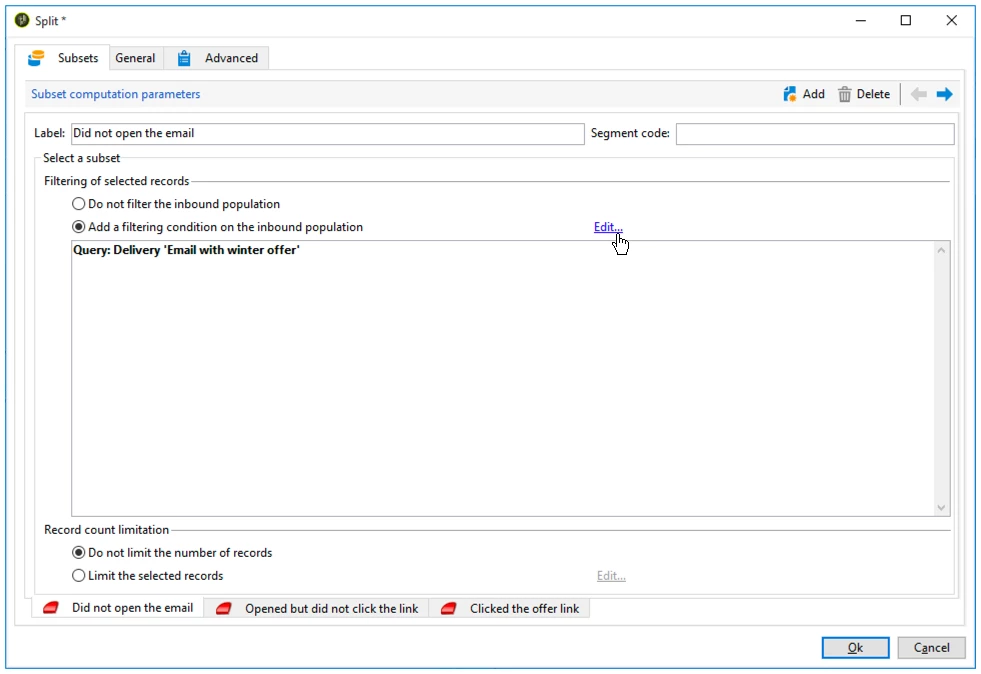 - For the first subset, select the Add a filtering condition on the inbound population option and click Edit .