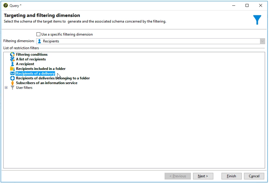 - Select Recipients of a delivery as the restriction filter and click Next .