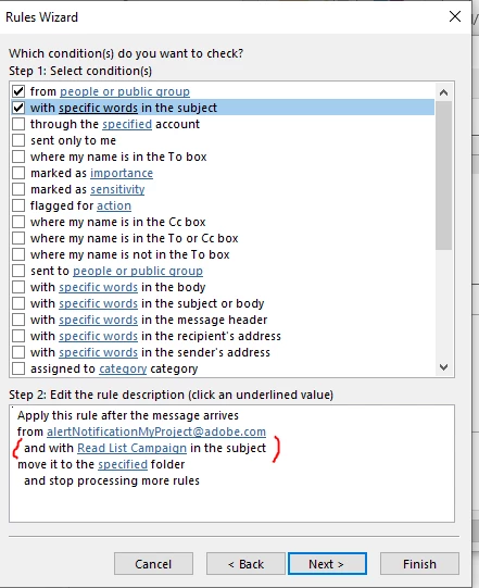 Or you can create a rule in outlook. Create a new folder in outlook, and provide the rule as below