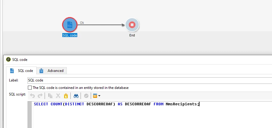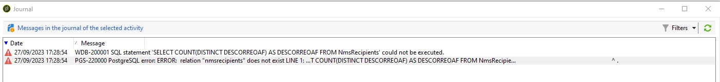 27/09/2023 17:28:54 PGS-220000 PostgreSQL error: ERROR: relation "nmsrecipients" does not exist LINE 1: ...T COUNT(DISTINCT DESCORREOAF) AS DESCORREOAF FROM NmsRecipie... ^ .