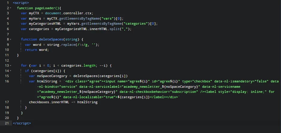 In our subscription page, we are running the next script in the HTML file (pageLoader is a function that allow us to access context variables and executes in the body of the HTML code as explained in a previous question https://experienceleaguecommunities.adobe.com/t5/adobe-campaign-classic-questions/web-app-accessing-context-variables-from-client-side/m-p/630288#M20228)