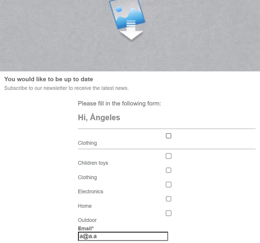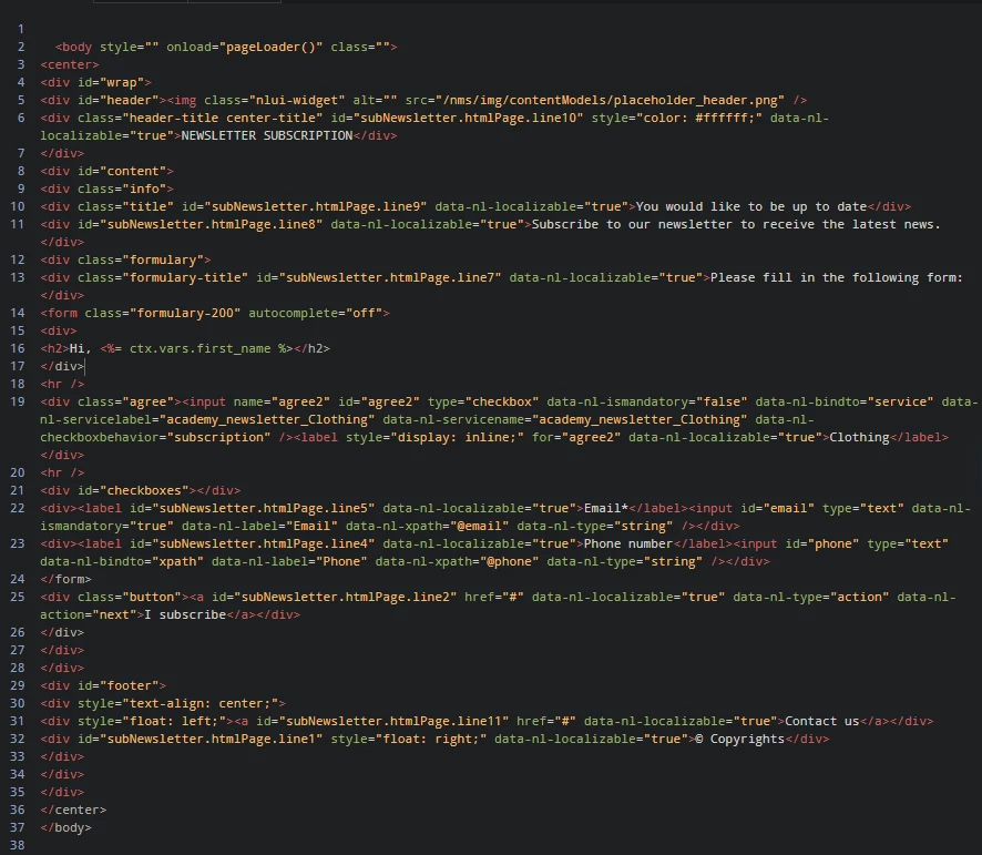- Div element with class="agree" (just after de first <hr.>): static element that comes by default in 'Subscription page' activity in a 'Newsletter subscription (subNewsletter)' workflow. Lets call it "Magic checkbox option".