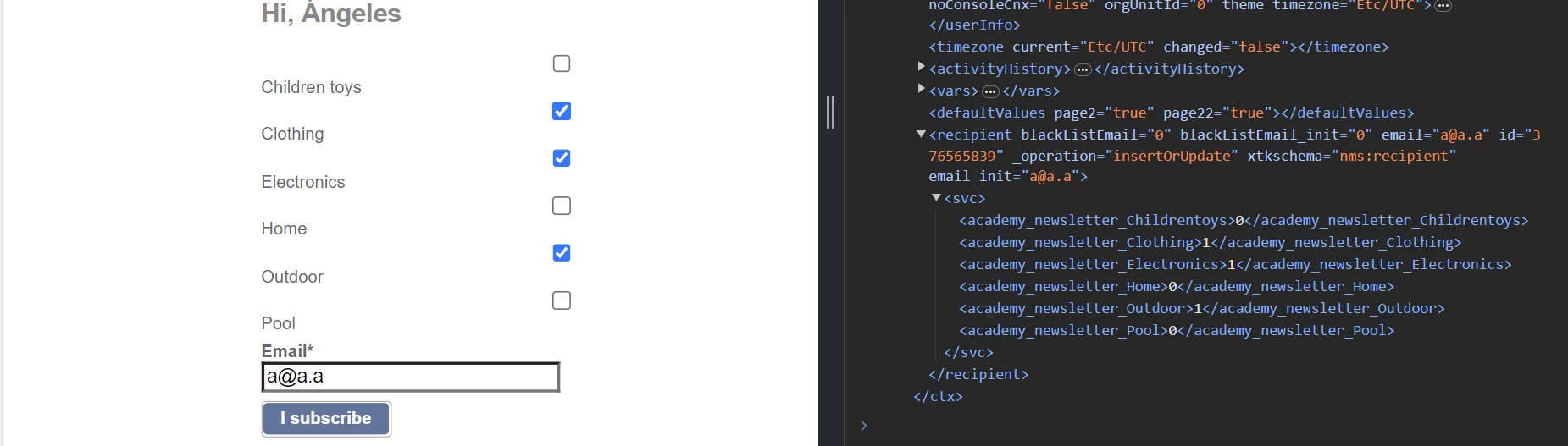 We can dynamically render the content with the for loop opening the Sandbox URL with Chrome, but none of the options actually works after clicking 'I subscribe' except for the "Magic checkbox option". That checkbox is the only one that actually subscribe the recipient in the newsletter specified in the line.