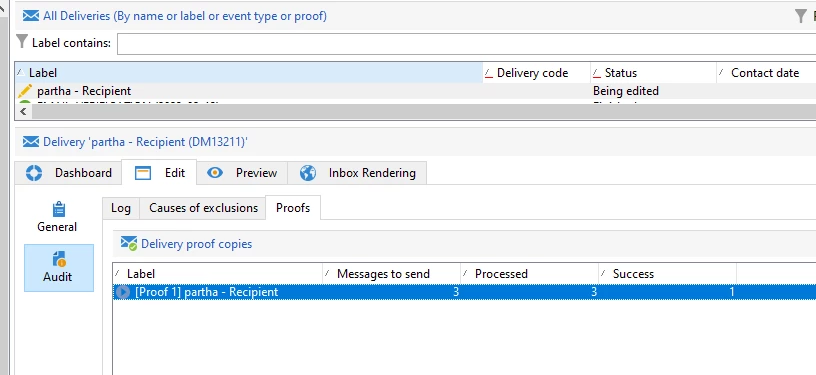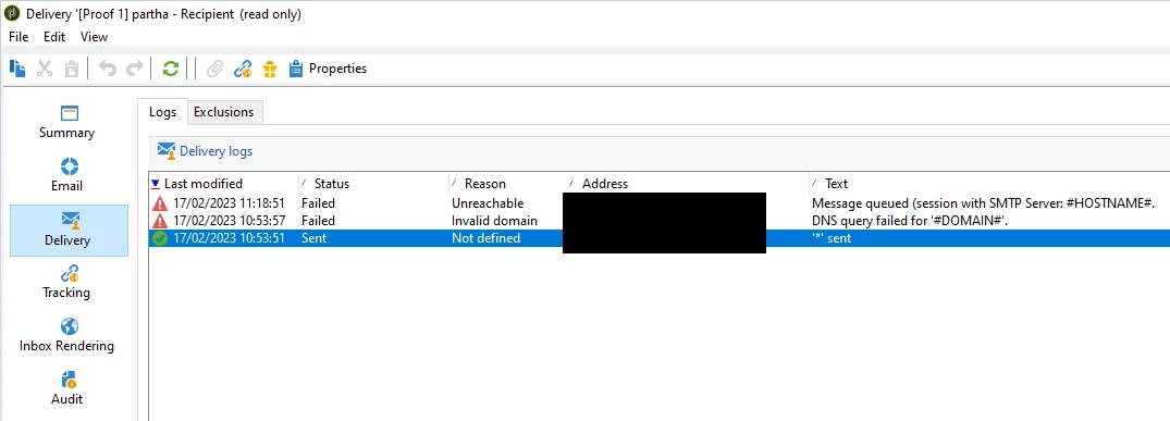 Now navigate to delivery tab > and can find the sent/failed logs and exclusion reasons for the seed address configured in the proof.