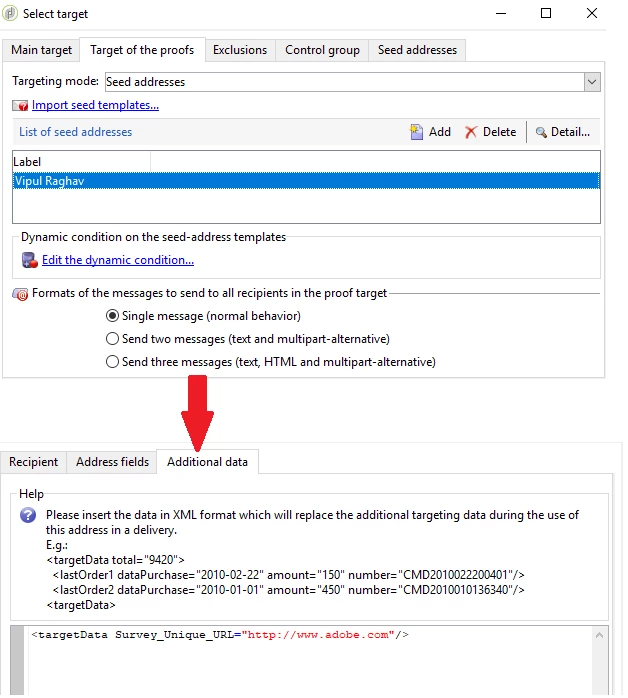 So, my seed address have to have additional data containing <targetData Survey_Unique_URL=”http://www.adobe.com” />