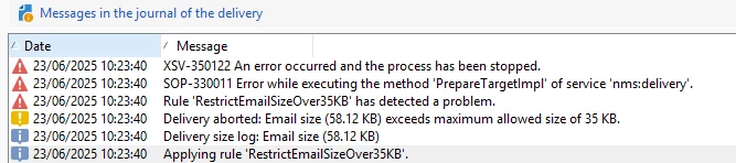 // JavaScript code to check email size in Adobe Campaign var sg = new StringGroup("nms:core"); var maxSizeInBytes = 35 * 1024; // 35KB = 35 * 1024 bytes var sizeInBytes = 0; // Safely access HTML content length if (delivery && delivery.content && delivery.content.html && delivery.content.html.source) { sizeInBytes += delivery.content.html.source.length; // Add HTML content length } // Safely access text content length if (delivery && delivery.content && delivery.content.text && delivery.content.text.source) { sizeInBytes += delivery.content.text.source.length; // Add text content length } // Log size for debugging logInfo("Delivery size log: Email size (" + (sizeInBytes / 1024).toFixed(2) + " KB)"); // Check if size exceeds limit if (sizeInBytes > maxSizeInBytes) { logWarning("Delivery aborted: Email size (" + (sizeInBytes / 1024).toFixed(2) + " KB) exceeds maximum allowed size of 35 KB."); return false; // Exclude the delivery } return true; // Allow the delivery