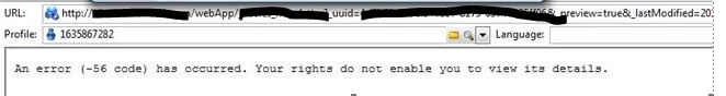 This is the error Adobe Support can see from the web logs:' Previews are not authorized via the XXX address. (iRc=-56)'