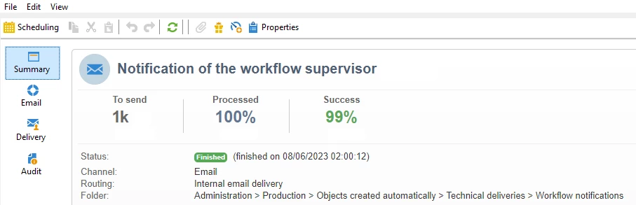 By default, when you assign a supervisor in WKF Property, if the workflow gets failed, Notification will be sent to the assigned operator group using 'notifySupervisor' delivery template. And its delivery will be created under /Administration/Production/Objects created automatically/Technical deliveries/Workflow notifications/ . Navigate to this folder and search for 'Notification of the workflow supervisor' delivery and open it.