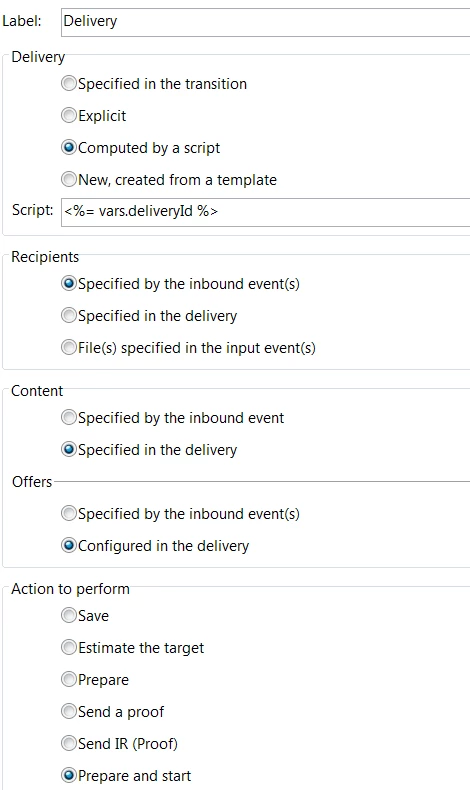 However, the Delivery item after the script didn't have clear directions on how to configure. I had the following options checked, and I got an error saying, "The transition does not specify a content identifier". How should the delivery object be configured to send out correctly?