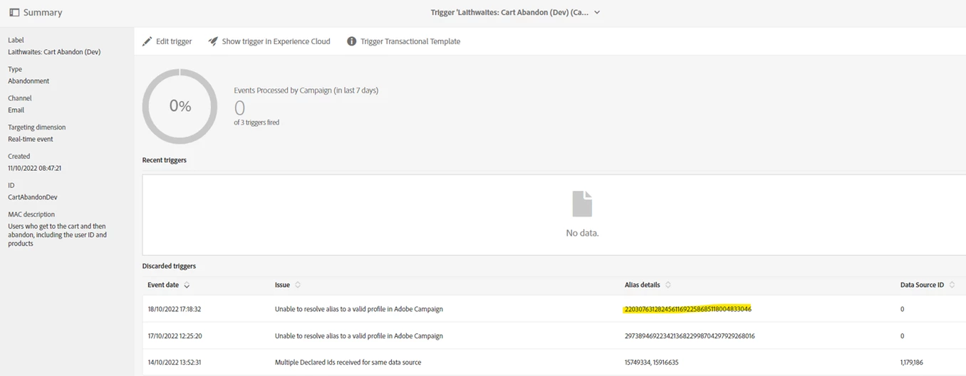 We have setup an abandoned basket live trigger for a client, and we`re having some issues when reconciling back in Adobe Campaign Standard.