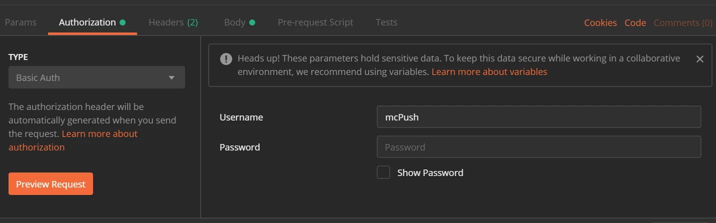 I am a new user/developer in ACS and I am trying to create a transactional message on the ACS Sandbox, I was able to create an Event and configure it to have a few fields, So I was trying to set up the REST API in Postman to make the POST requests for the Transactional Messages, but I got stuck in the authorization part. I am not sure where I can find the password for the Basic Auth. I am not sure if I can use another way of authorization and which that would be.