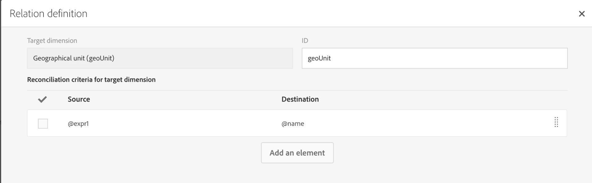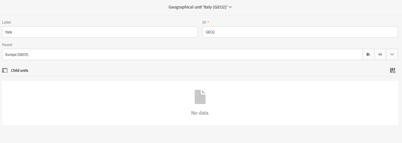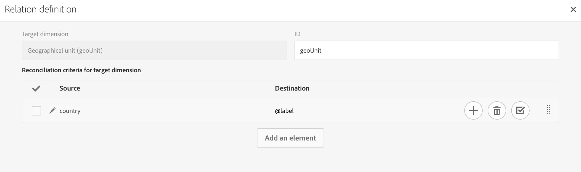 2. Then, I use a reconciliation activity. I use the "Relations" tab only to tell the system that the data I am importing from the file contains also information related to the geounit resource (using the country column of the file). In this specific example, values of the country column of my file ("France" and "Italy") correspond to the Label field of my geounit resource, so I create the link with @label.