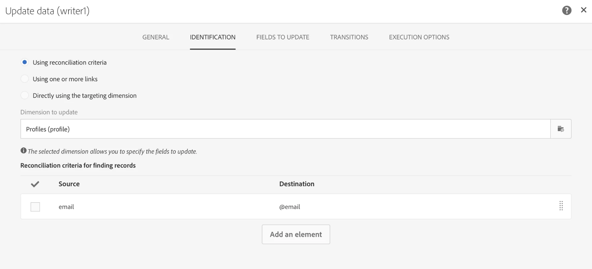 In the "Identification" tab, I select "Using reconciliation criteria" and keep Profiles as dimension to update. As a reconciliation key, I use the email column of my file and the email field of my database. You may use another key to match your requirements (if you use a specific field or combinations of field to identify unique records).