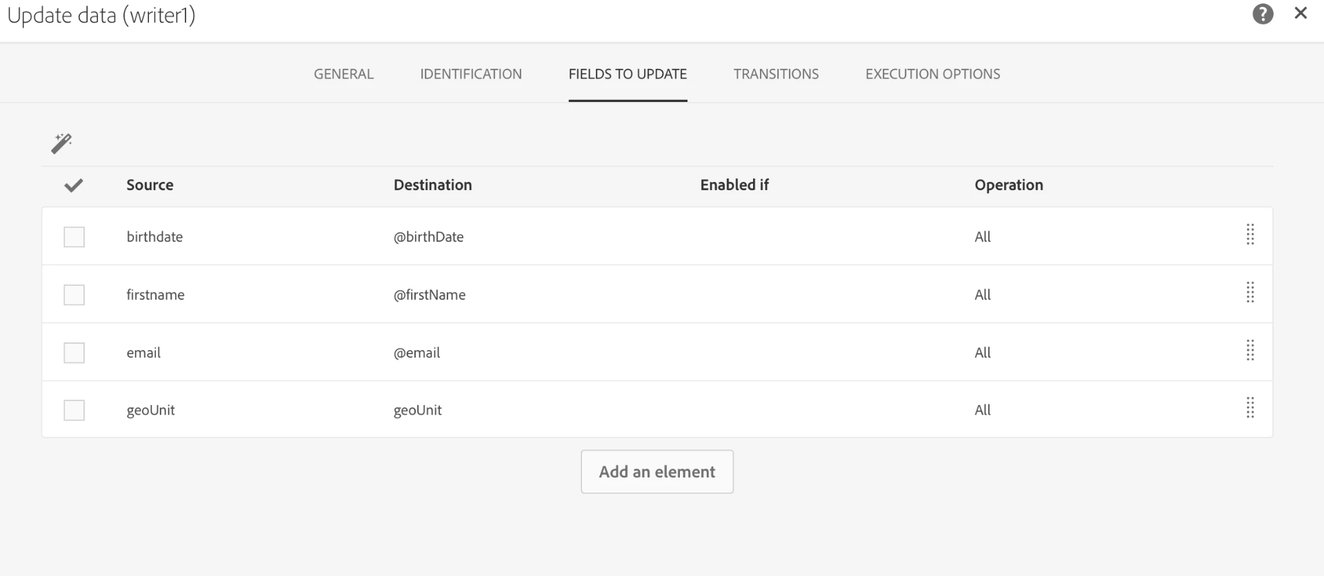In the "Fields to Update" tab, I use the magic wand. I notice here that the system automatically added a "geounit" field to update, thanks to the link I have created in the "Relations" tab of my reconciliation activity.