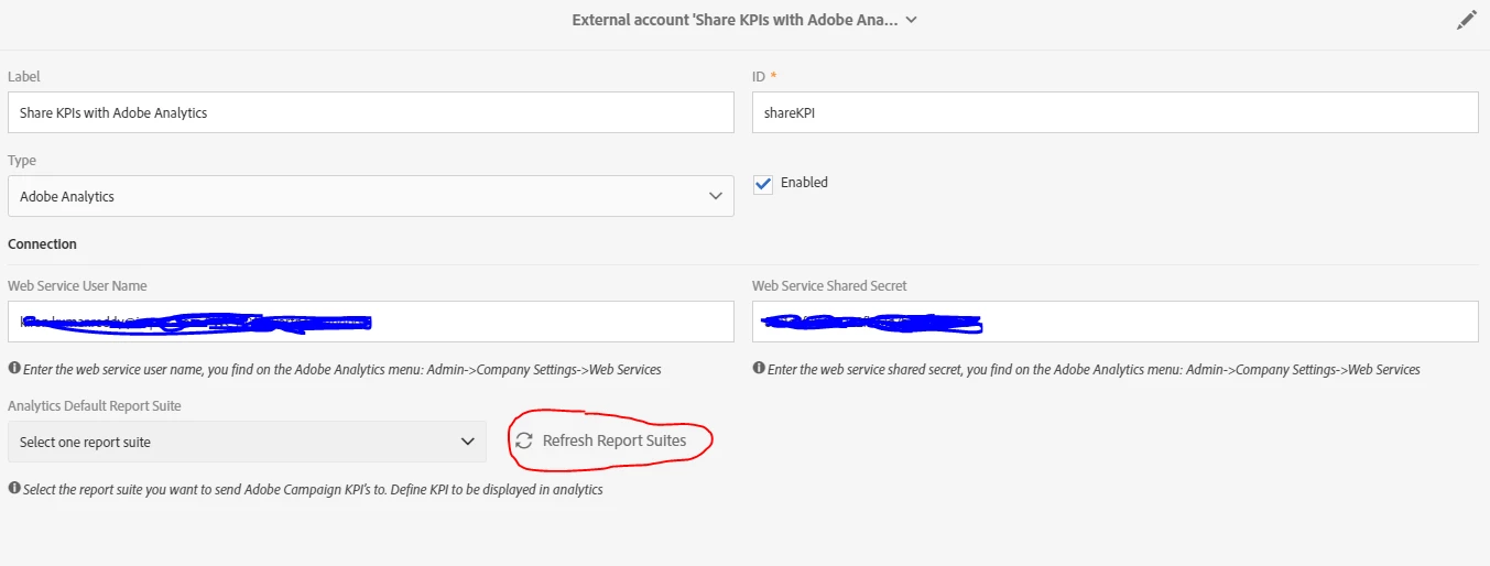 I am trying to share the ACS KPIs to Analytics report suite and while configuring the campaign external account i am not able to select the required report suite as the list is not getting refreshed, i have enabled the campaign reporting in Analytics report suite and also have configured the classifications but still the integration is not happening, what might the issue?