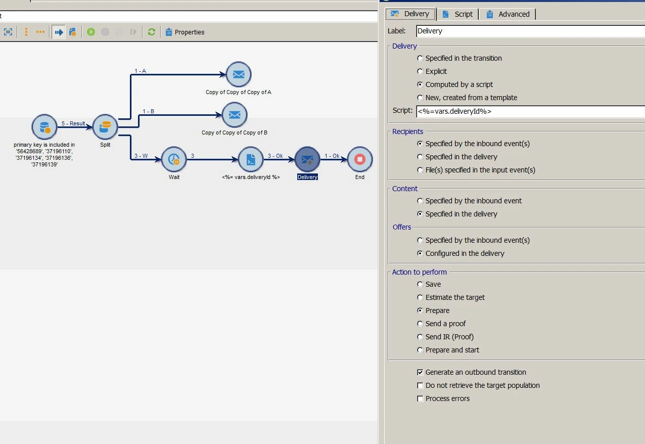 I have tried to use the A\B Testing workflow JS code from the A/B testing from the Adobe Campaign 6.1 document. It creates the A B populations and selects a winner but it is always A even if B has opens and A does not. I have inserted the <%= vars.deliveryId %> variable in the delivery and tried both the manual and automatic option for validationMode.