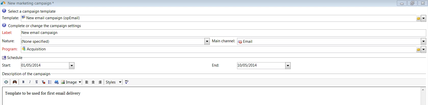 From the "New marketing campaign" window shown below I don't see a refresh option.  When I clicked on OK with both Start and End dates selected prior to the current system date the Campaign accepted the dates and closed the window.