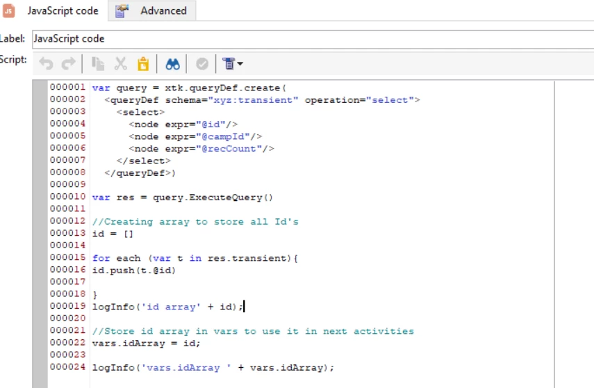 You can store the query results in an array using for each loop in the query result and store it in vars to use it further in upcoming activities.