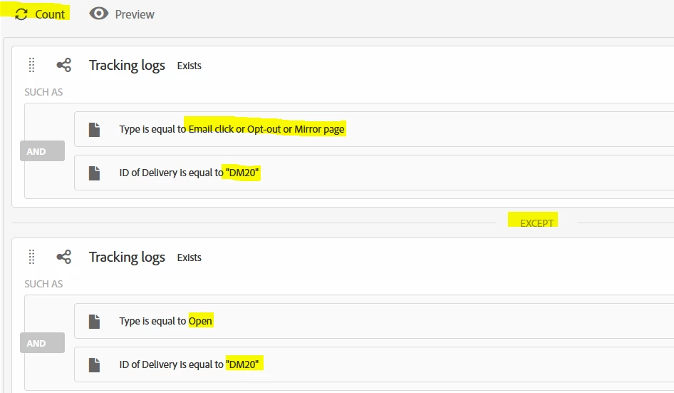 I have a DM that has finished delivery, I want to get a count of recipients who have click event recorded but did not have any open event recorded against them.