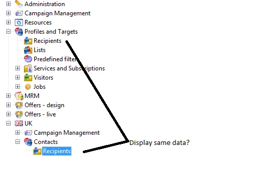 I have created a new recipient folder - I want to somehow make it display the data in the master recipient folder (which I can then filter down to a per region basis further using the restriction option). Is there a way to do this without updating the data into multiple folders? I can't seem to change any of the parameters to allow this to happen.