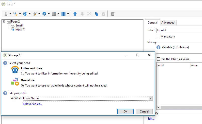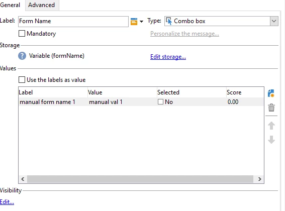 Can anyone tell me what the process is to have a Combo Box on a page that is pulling its values from a table or list and passing which passes that value to my variable [formName]?