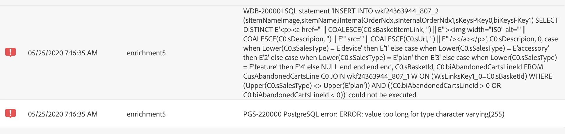 The above approach works fine when each variable itemNameImage in collection holds value whose size is less than 255. When it exceeds size 255, campaign throws error as in screenshot below.