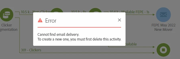 I was opening a workflow delivery in order to compare to a existing campaign for research. The delivery activity appears in the workflow but when I click to open it i get the following message. Has anyone experienced this before? If so, is there any way of restoring the delivery?