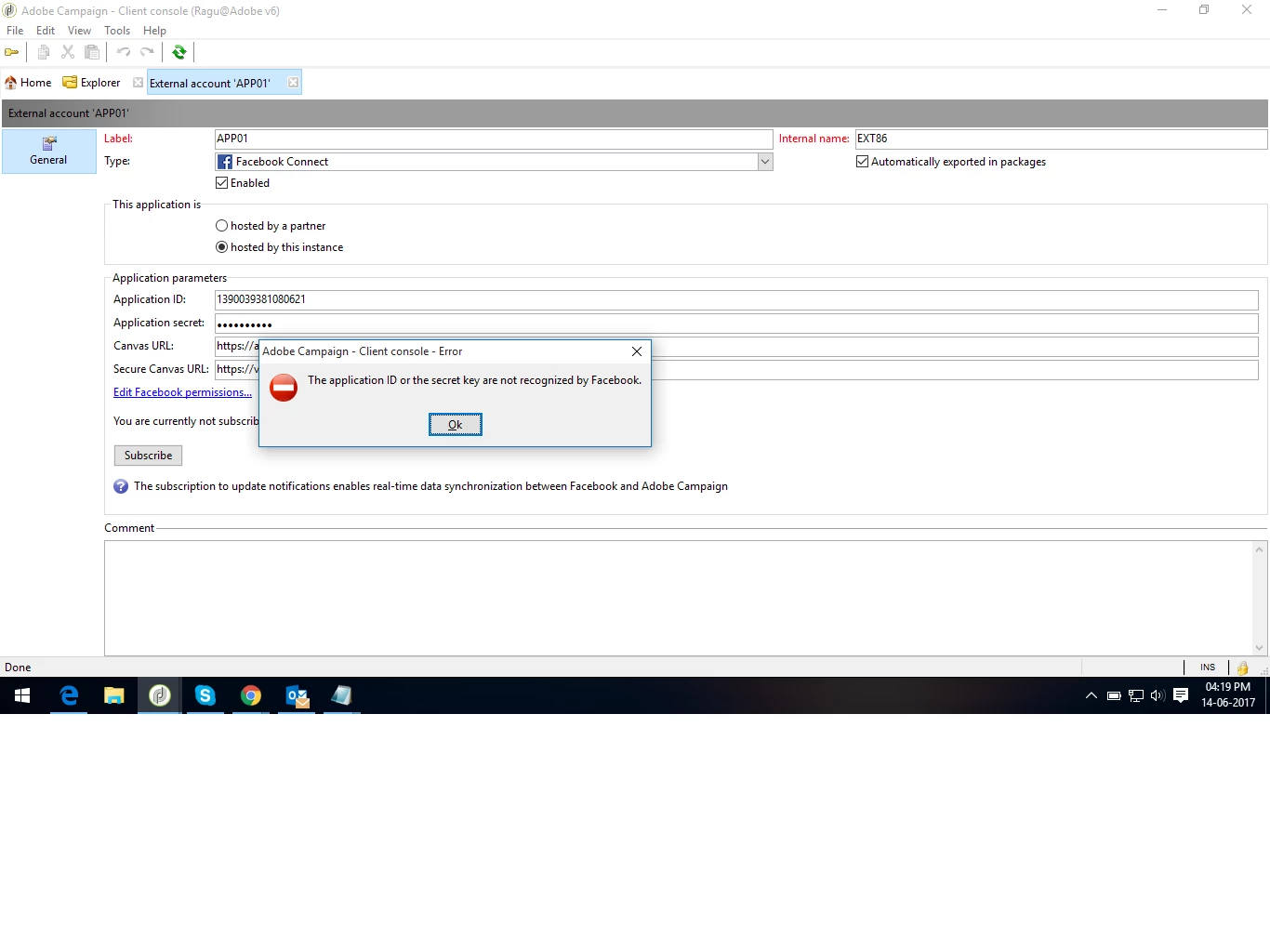 When i create the facebook external account on adobe campaign it showing the error like "Application id or secret key are not recognized by facebook".but my application id and secret key is copied from facebook only.What i did wrong please help me.Please refer the attachment for your reference