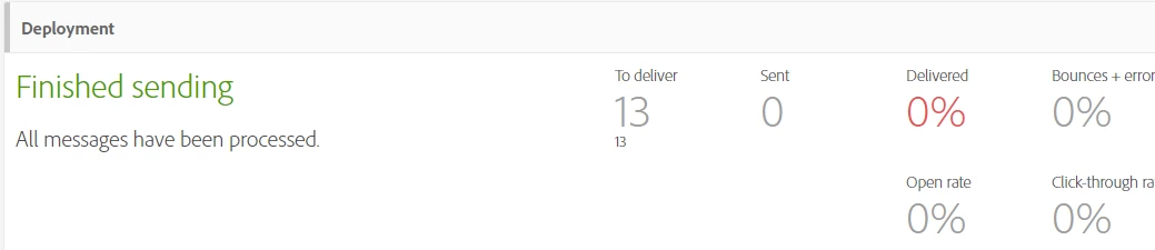 We have created a transactional message from an event. When we launch API, the json is received and processed to deliver in the delivery but it is not sent (the number of sent is 0 vs 13 of delivered.