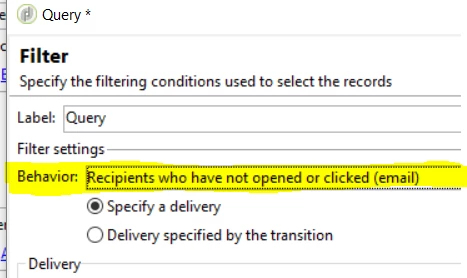 You can achieve the same by using a query activity in a workflow and filter on recipients who have not opened or clicked in a delivery