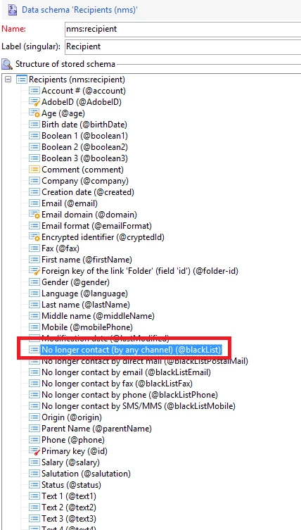 There is an attribute in nms:recipient schema named @blacklist which can be set to true or Yes if you wish that the recipient is never sent a communication, even by mistake.