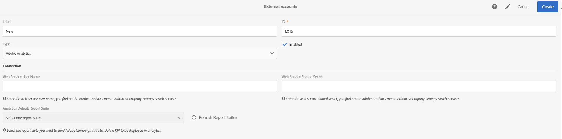You can setup Integration between Adobe Analytics and Campaign by setting up an External Account within ACS of type Adobe Analytics, enter the Web Service Credentials (from Analytics) and select the desired Report Suite as below: