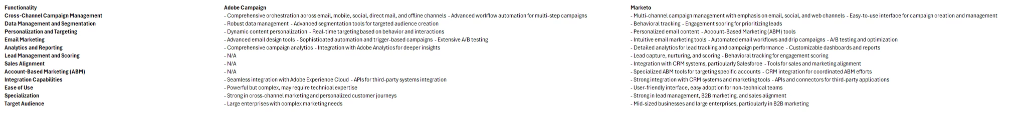 Both share several features and are aligned in many respects. Adobe Campaign is more suited for enterprises with complex, large -scale marketing needs, while Marketo excels in lead management and B2B marketing, appealing to medium and large enterprises.