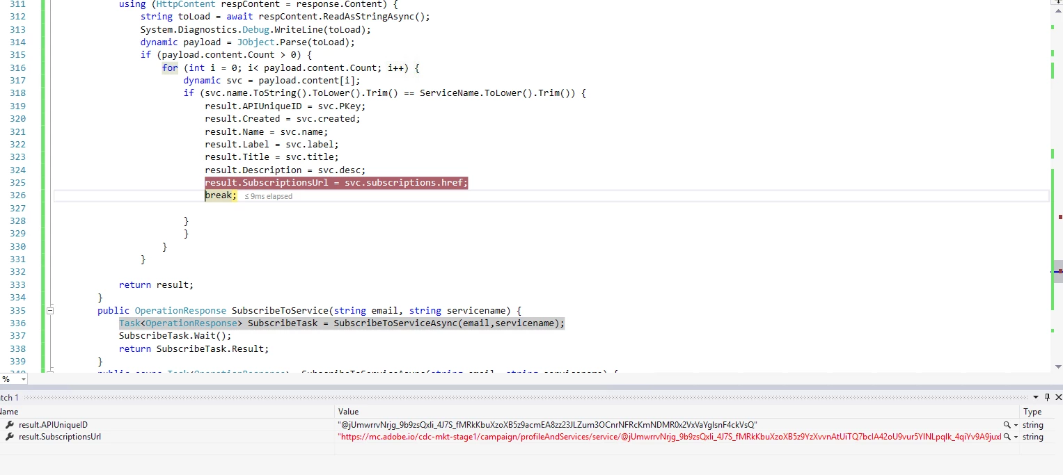 Anyone have a suggestion where to go from here? The subscribe to service function I have written is below...
