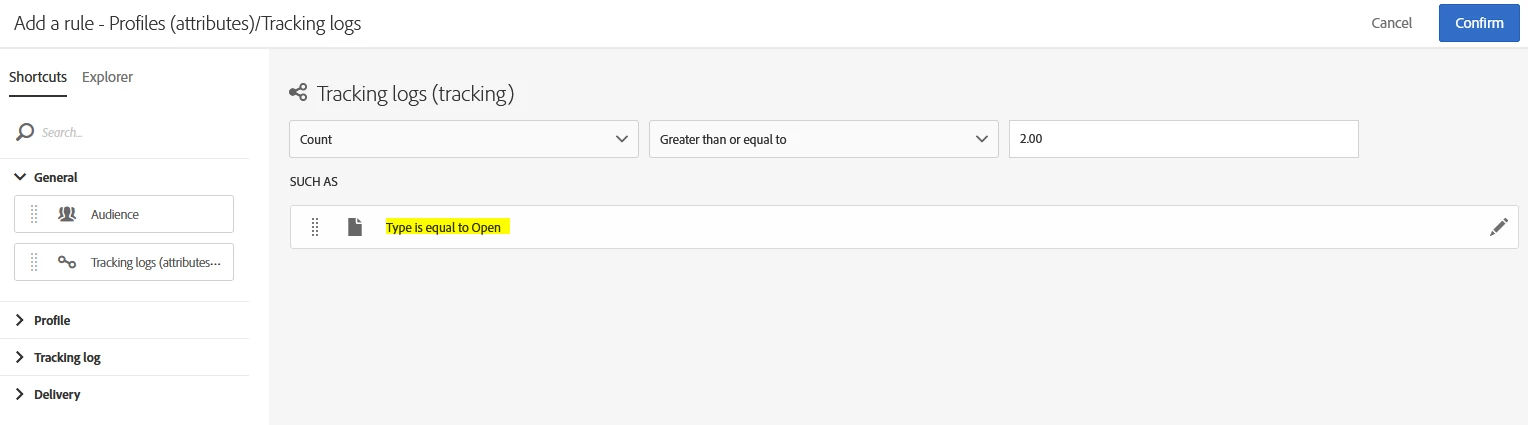 I am wanting to target profiles who have opened at least 2 deliveries during their lifetime in ACS. I can easily segment out profiles who have at least one existing tracking log with the type set to Open, but how do I query those who have 2 open actions?