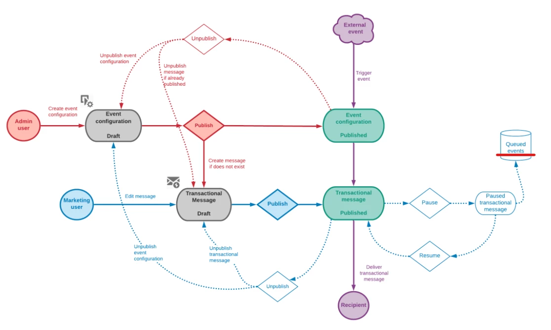 We can suspend publishing our transactional message by using the Pause button. The events are therefore no longer processed, but instead kept in a queue in the Adobe Campaign database.