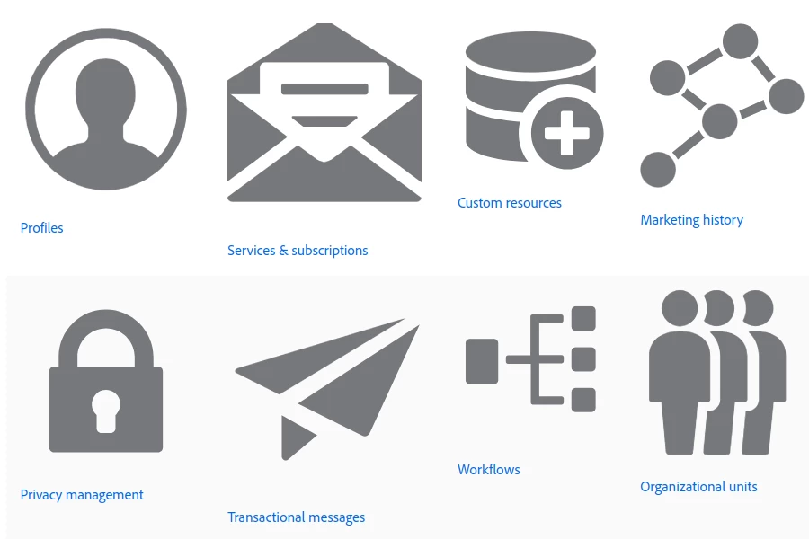 I have looked in this documentation . This seems to only expose profiles, services and workflow although there are a lot more resources available in adobe campaign like, email template, images, campaigns etc.