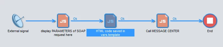 In "Call MESSAGE CENTER" script I can successfully send a transactional (message center) message if I exclude vars.template (that contains an HTML template that I receive from an external source).
