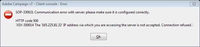I am unable to connect to Adobe Campaign 7 - local IT have followed all installation steps, and IP address has been white listed. However I am receiving following error when trying to log in.
