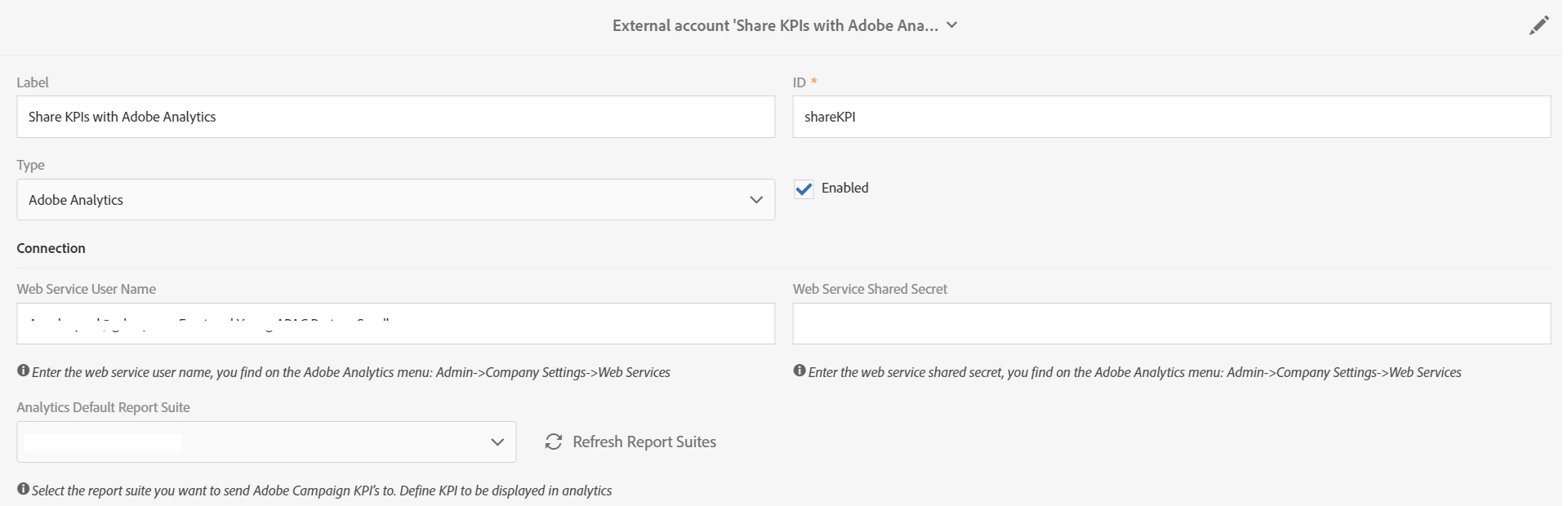We are using external account (Share KPIs with Adobe Analytics ) to get Adobe campaign reports in adobe Analytics. We have followed the below documentation for the same
