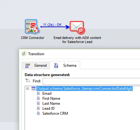 Is it possible to realize that with a campaign workflow that consists of the following steps: CRM Connector -> Email delivery? When running such campaign, we encounter a schema compatibility issue between the schema specified in the transition (temp schema?) and the schema defined in the delivery template.