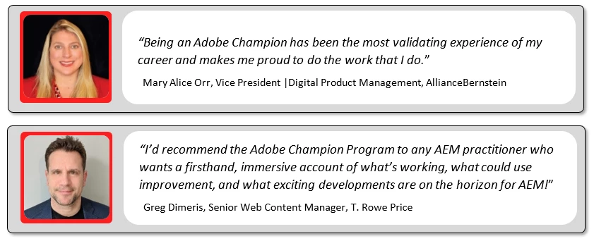 We’re certain you’ll receive tremendous value from the Adobe Champion Program but don’t just take our word for it. Here’s what current Adobe Experience Manager Champions have to say about the program: