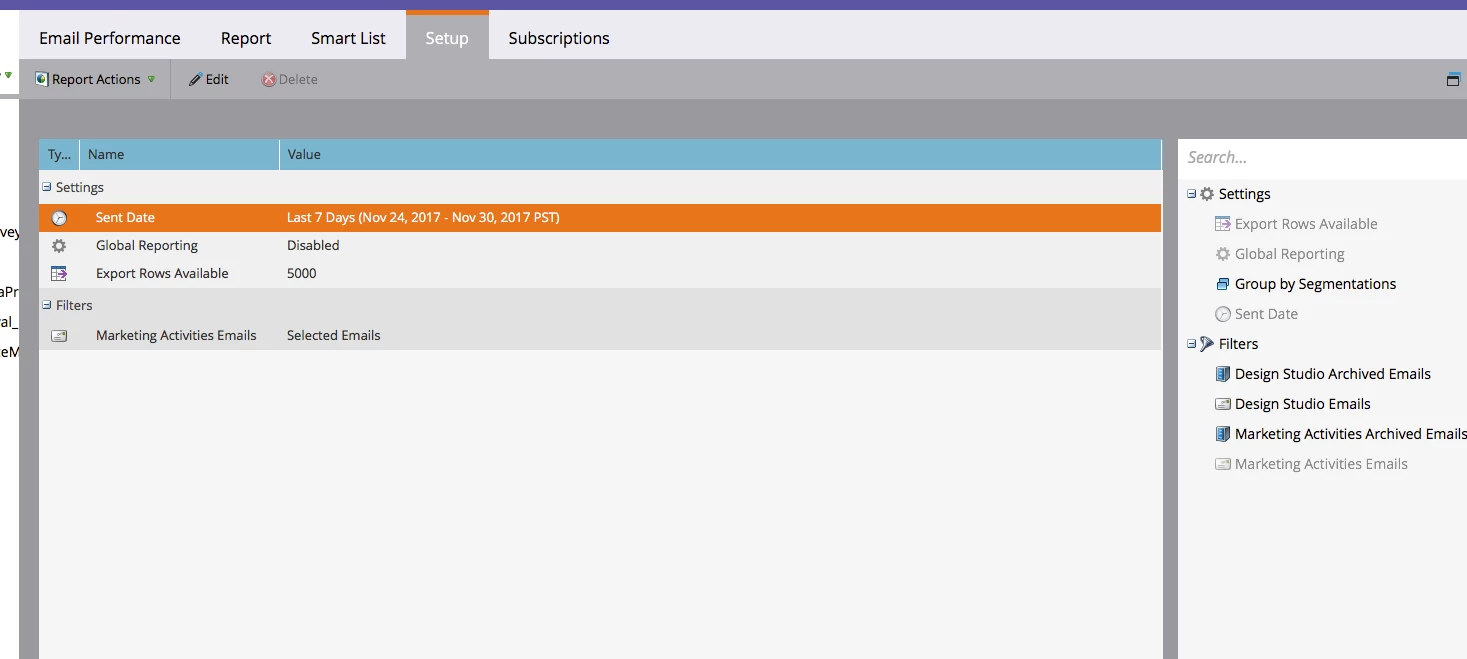 My manager is looking to get a weekly email report. In this report he wants to see high level email metrics for any email sent in the previous week. We 99% of the time, we're using email programs for this, not smart campaigns + email assets.