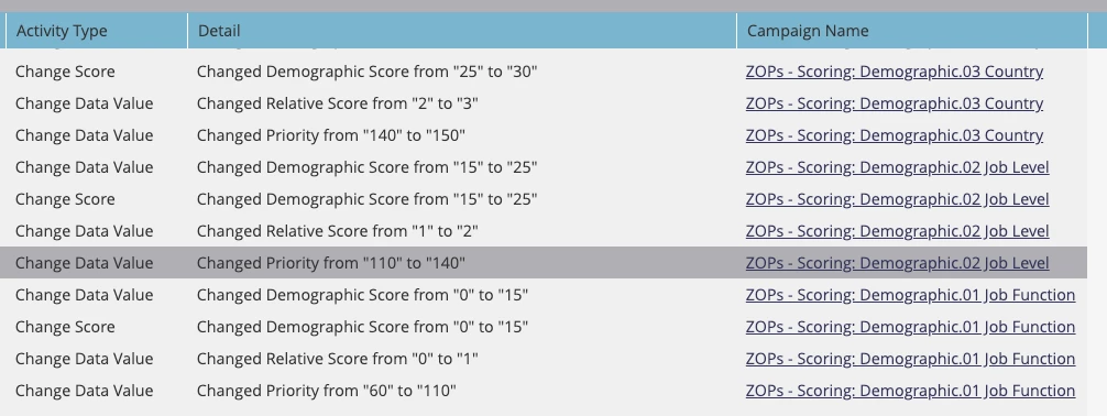 You’ll be able to see all the campaigns that have been triggered by your actions and dig deeper into them. The campaigns are linked on the right-hand side of the activity log  so you can easily jump straight to the right place in your Marketo instance to investigate.